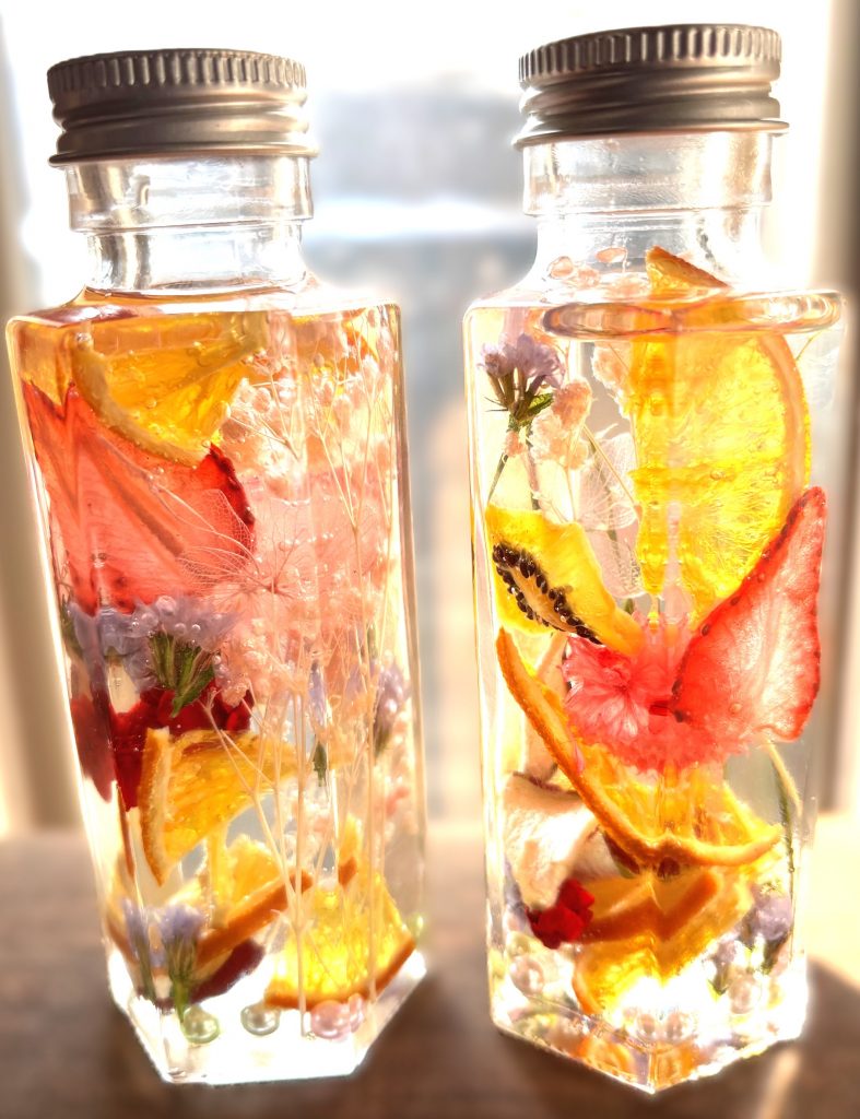 フェイクパールや花材、ドライフルーツを瓶に入れ自分だけのフルーツハーバリウムを作りましょう。(高さ:12㎝程度)